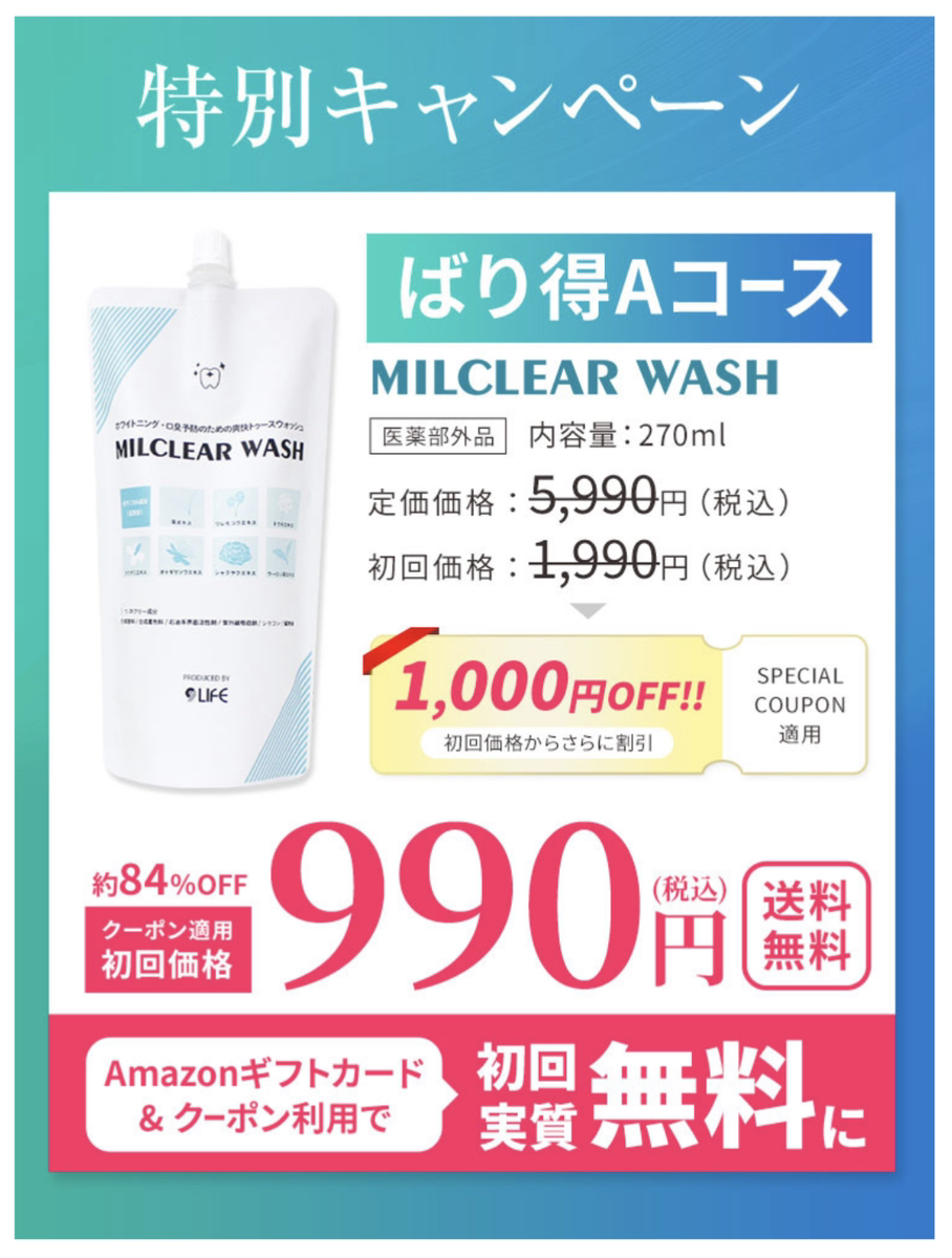 普通にマウスウォッシュを買う値段で買えたので、「ミルクリアウォッシュ」とりあえず買ってみました。