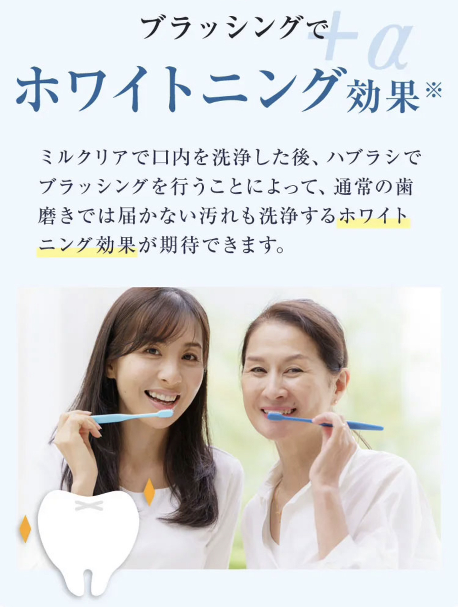 ミルクリアでマウスウォッシュした後、ブラッシングをするとホワイトニングも期待できるようです。